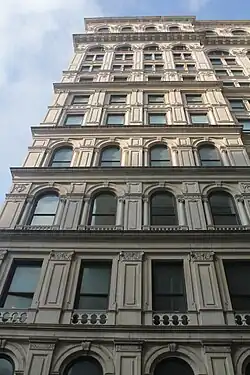 The 85 ft-high (26 m) building,[92] with four stories and a raised basement, occupied the western half of the block.[92][93] The site was irregularly shaped, with a frontage of about 200 ft (61 m) on Leonard Street and Catherine Lane.[92][94] Its marble facade included Ionic columns in a manner resembling the Erechtheion in Athens, as well as heavy plate-glass windows.[92][95] The basement had brick-and-stone walls;[92] the site sloped downward to the east, where the basement contained storefronts.[9] The central portion of the building was three stories high (excluding the basement) and was flanked by four-story pavilions at either end.[9][92] The main entrance on Broadway was through a portico, topped by a pediment with an eagle. Running west-east across the first floor was a 12 ft-wide (3.7 m) hallway, which was flanked by two large rooms and connected to a stair with an elevator shaft.[9] The old New York Life Building was one of the first buildings in New York City with an elevator.[96] After the building opened, Henry Fernbach designed a mansard roof, which was completed in 1879.[91][3]