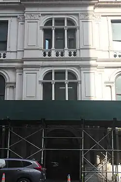 For the most part, the Leonard Street and Catherine Lane elevations are divided into bays with two windows per story.[34] At the center of the Leonard Street elevation, there is a three-bay-wide entrance pavilion that projects slightly from the facade. At ground level (actually the basement), the main entrance is through a double-height round arch.[32] The doors in this arch are topped by spandrel panels with foliate patterns.[23] The main entrance is flanked by two pairs of two single-story pilasters, one stacked above the other. The bays on each side of the doorways contain round-arched openings. Above the basement, the central bay of the entrance pavilion contains three windows per story, while the other bays contain two windows. The windows on the upper stories are largely similar in design to those on the rest of the facade.[32]