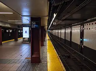 The station's token booths were shuttered in May 2005, after fare tokens were replaced with MetroCards; station agents were deployed elsewhere in the station to answer passengers' queries. This was part of a pilot program that was tested at seven other stations.[61] To save energy, the MTA installed variable-speed escalators at 34th Street–Herald Square and three other subway stations in August 2008,[62] although not all of the escalators initially functioned as intended.[63] A Korean restaurant, Nōksu, opened on the station's mezzanine level in late 2023.[64][65] In November 2024, the United States Department of Transportation provided a $72 million grant to cover two-thirds of the design and engineering phase of the renovation of New York Penn Station. Among other things, the project will include a direct connection from the 34th Street–Herald Square station to Penn Station.[66][67]