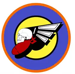 - ^ Approved 17 July 1944. Description: A yellow orange disc within a grayed blue annulet, piped back and bordered orange, surmounted by a white death's head with stylized wings of the sane, shaded blue, above a red aerial bomb, falling to dexter base, all casting deep drop shadow black.