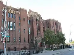 The main facade, to the east, contains numerous recessed and projecting sections, alternating with each other.[50][54] This facade contains its main entrance pavilion in the center, and two asymmetric side pavilions to the north and south.[54][56] Above the entrance pavilion is a sandstone surround, which contains the carved letters "369th Infantry N.Y.C." and is flanked by eagle-wing motifs that contain lanterns.[54] The raised basement also contains entrances surrounded with sandstone trim.[56] Adjacent to the eastern facade is a circular driveway with an adjacent small parking lot. A small lawn is located between the driveway and Fifth Avenue.[50] A statue to the 369th Regiment stands across Fifth Avenue from the administration building.[57] The northern and southern facades are located next to the sidewalks of 143rd and 142nd Streets, respectively.[50]