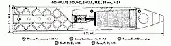 This shell used the M56 point detonating fuze. The complete round weighs 1.99 lb (900 g); as fired, the projectile weighs 1.34 lb (610 g). The 0.16 lb (73 g) charge of M2 powder is a Hercules NG formula of single perforated grains with 0.03 in (0.76 mm) web and gives the projectile the prescribed muzzle velocity of 2,000 ft/s (610 m/s).
