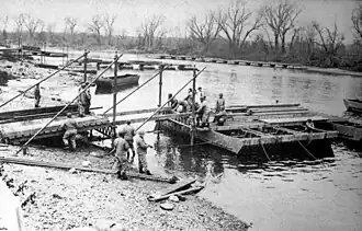 371st Engineer Construction Battalion or 371st Engineer Battalion[1] was activated as a Special Service Regiment in February 1944, as a unit in the United States Army. Later this unit was redesignated a General Service Regiment. The unit was formed at Camp Ellis, Illinois from some regular Army officers and enlisted men, trained in the United States, then shipped overseas early in World War II to Riverside Station, Liverpool, England. They were the vanguard of many others to follow, including infantry and armored troops. Their purpose was to build facilities in preparation for those to follow. After the Normandy Invasion, they followed the front lines constructing roads, railroad bridges, hospitals, and other infrastructure needed by the advancing Armies. Serving until the surrender by Germany, the unit was discharged from the military on 8 November 1945 and the service members returned home.