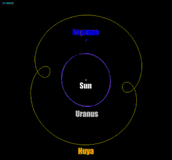 Huya is a trans-Neptunian object (TNO) in a 2:3 mean-motion orbital resonance with Neptune, meaning that Huya completes two orbits around the Sun for every three orbits completed by Neptune.[2] Due to its 2:3 orbital resonance with Neptune, Huya is classified as a plutino, a dynamical class of objects with orbits similar to that of Pluto.[15] Huya orbits the Sun at an average distance of 39.4 AU (5.89 billion km; 3.66 billion mi), taking 247 years to complete a full orbit.[5][f] Huya's orbit is inclined to the ecliptic by 15.5 degrees, slightly less than Pluto's orbital inclination of 17 degrees.[1][29] It has an elongated orbit with an orbital eccentricity of 0.28. Due to its eccentric orbit, its distance from the Sun varies over the course of its orbit, ranging from 28.5 AU at perihelion (closest distance) to 50.3 AU at aphelion (farthest distance).[1] Like Pluto, Huya's orbital resonance prevents close approaches to Neptune.[30] The minimum orbit intersection distance (MOID) between Huya and Neptune is approximately 1.4 AU,[4] but due to the resonance, the two never come closer than 17 AU of each other.[31]