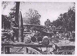 They were originally designed as the main armament of the Bayern-class battleships, but were deployed in fixed (Anschiessgerüst) and semi-portable (Bettungsgerüst) concrete emplacements that took weeks to months to build.[1] One obvious change made for land service was the placement of a large folding counterweight just forward of the trunnions to counteract the preponderance of weight towards the breech. This, although heavy, was simpler than adding equilibrators to perform the same function. It folded to lower the gun's height while travelling.[2]