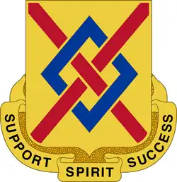 • Shield: Scarlet and buff (gold) are the colors used for Support. The fret (formed by the saltire and the mascle) is symbolic of the interlaced support provided the combat elements. The blue mascle also alludes to the blue band bordering the white diamond of the Arkansas state flag and refers to the home area of the organization.