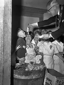 The traditional meal associated with the festival is herring and white bread (haring en wittebrood).[7][8] Cleaned herring along with a small loaf of white bread are handed out to city residents for free at the Weigh House (De Waag) at dawn on the morning of 3 October, but prior registration and tickets are required.[9] On the evening of 2 October, hutspot (a dish representative of the stew found in the Spanish troops' camp) is served at an event located on the Hooglandsekerkgracht, a street in the center of the city.[10] Leiden-based band Rubberen Robbie's song "Drie Oktober" also commemorates the festival, and its lyrics refer to herring, hutspot, drinking, and partying.[11]