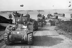 The battalion crossed the English Channel aboard Landing Ships, Tank (LSTs) landing on Omaha Beach on 23 June 1944. They took off the waterproofing from their tanks and drew additional ammunition before moving inland. For the next two weeks the troops conducted patrols and prepared for the breakout from the Normandy perimeter.[7]