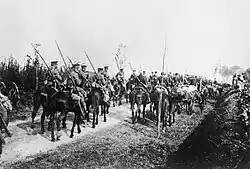 With The Cavalry Division, the brigade took part in a number of actions during the early war of movement, notably the Battle of Mons (23–24 August) and the Battle of Le Cateau (26 August).[19] On 6 September, it joined the formerly independent 5th Cavalry Brigade in Gough's Command (under 3rd Cavalry Brigade's Br-Gen Hubert Gough). As part of Gough's Command, it took part in the First Battle of the Aisne (12–15 September). On 13 September, Gough's Command was redesignated as 2nd Cavalry Division with the addition of divisional troops (RHA, RE, etc.).[20] It remained with 2nd Cavalry Division on the Western Front until the end of the war.[21]