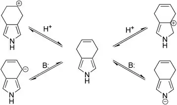 Though it was expected that under acidic or basic conditions the migration of double bond in 4,7-dihydroisoindole would happen, this does not take when either strong bases (potassium tert-butoxide, potassium hydroxide) or acids (trifluoroacetic acid, p-toluenesulfonic acid) are involved. A likely reason for such stability is that the pyrrolic residue is more acidic (as NH-acid) as well as more nucleophilic than the respective reaction centers involved in the anticipated double bond migration; thus, the pyrrolic ring may serve to protect the double bond from the initiation of both carbocationic and carbanionic shifts.