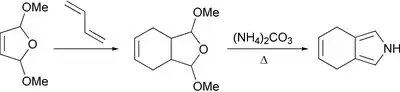 An early attempt to access 4,7-dihydroisoindole — the closest relative of thermodynamically unstable isoindole was performed 1985.[1] It was based on the classical Paal-Knorr synthesis under conditions which probably harmed the electron-rich pyrrole ring. Observed instability of 4,7-dihydroisoindole led researchers to conclude that it was not a useful intermediate in the porphyrin chemistry.