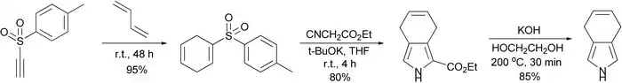 It turned out that changing the conditions made it possible to isolate 4,7-dihydroisoindole. Three-step synthesis starting from tosylacetylene which includes Diels-Alder reaction, Barton-Zard synthesis and thermal decarboxylation was reported.[2]