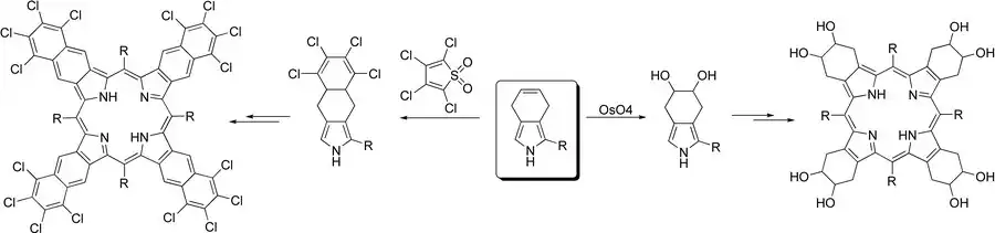 4,7-Dihydroisoindole is universally a synthon of extended porphyrins, since its isolated double bond in the annelated cyclohexene ring can allow for modification by addition or cycloaddition reactions. Addition reactions can furnish new intermediates for benzosubstituted tetrabenzoporphyrins, while the use of cycloaddition reactions can lead to new tetranaphthoporphyrins.[3]