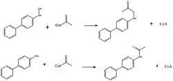 Cytochrome P450 1A2 oxidizes 4-aminobiphenyl to N-hydroxy-4-aminobiphenyl. Following O-acetylation, the latter can form DNA adducts. O-Acetylation reactions are catalyzed by NAT, N-acetyltransferase; and UDP-glucuronosyltransferase (UGT) enzymes.[12] Two different enzymes can catalyze this reaction, NAT1 and NAT2. These enzymes can also N-acetylate 4-aminobiphenyl. N-Acetylated products are difficult to oxidize and because of this acetylation is considered a detoxification step for aromatic amines.
