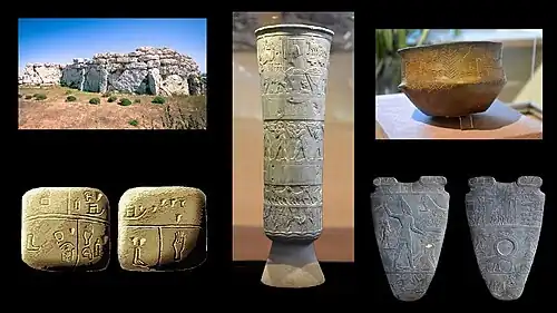 From top left clockwise: The Temple of Ġgantija, one of the oldest freestanding structures in the world; Warka Vase; Bronocice pot with one of the earliest known depictions of a wheeled vehicle; Kish tablet, an example for proto-writing; Pharaoh Narmer is credited with uniting Upper and Lower Egypt and is depicted as such in the Narmer Palette.
