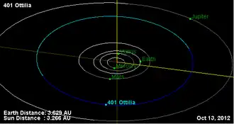 The semi-major axis of the orbit of 401 Ottilia at 3.47 AU lies just outside the 2:1 Kirkwood gap, located at 3.27 AU.[2] 401 Ottilia is part of the Cybele asteroid group.[3]