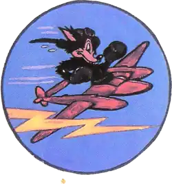 The 428th Fighter Squadron was activated on 1 August 1943 as a Lockheed P-38 Lightning fighter squadron under IV Fighter Command in Southern California as part of the 474th Fighter Group. It trained with the P-38 over the Mojave Desert, moving to the European Theater of Operations, and was assigned to Ninth Air Force in England during March 1944. It operated out of Warmwell, Britain, and Saint Lambert, St. Marceau, and Peronne, France, Florennes, Belgium, and Strassfeld, Langensalza, Schweinfurt, and Stuttgart, Germany during and immediately after the war in 1945. Squadron markings on the vertical tail surfaces were a black triangle and "F5" with call sign "Geyser".[2][3] It provided bomber escort but the primary role was as an attack and interdiction fighter. It flew its first combat missions on 25 April 1944. As part of the 474th Fighter Group, they attacked bridges and railroads in France in preparation for the Normandy invasion, provided air cover for the invasion force, and flew bombing missions to support the landings. Subsequently it conducted armed reconnaissance missions after D-Day and attacked highways and troops to support the Allied breakthrough at St Lo. The Squadron supported the British attack on Holland in Sep 1944; the Battle of the Bulge Dec 1944-Jan 1945; and the airborne assault across the Rhine in Mar 1945. As part of the 474th, it was awarded the Distinguished Unit Citation for a mission on 23 August 1944[4] and twice the Order of the Day, Belgian Army.[2] Personnel were demobilized in Europe during 1945, returned to the United States in November as an administrative unit and was inactivated on 7 December 1945 without personnel or equipment.