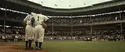 Supervising art director Thomas Hoover and the visual effects team, led by Jamie Dixon of Hammerhead, utilized historical research, scanned architectural drawings, and digital modeling to construct a 1,200-foot-long, 40-foot-high green screen for scenes set in Ebbets Field. The visual effects team digitally rendered the outfield and portions of the infield.[45] Engel Stadium was used as the foundation for the recreation, as it was one of the oldest existing ballparks and had historical ties to Robinson. The production adapted the structure by modifying its layout to match Ebbets Field's dimensions, adjusting the infield angles, and reconstructing key elements such as the dugout, scoreboard, and fences. In addition to Engel Stadium, the film used Luther Williams Field in Macon, Georgia, and Rickwood Field in Birmingham, Alabama, both of which had connections to Robinson's career. Engel Stadium also served as a stand-in for Crosley Field in Cincinnati.[45]