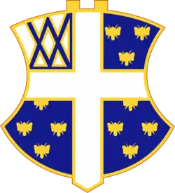 A Gold color metal and enamel device 1+1⁄4 inches (3.2 cm) in height consisting of a shield blazoned: Azure, semé of bees Or, a cross Argent, on a canton of the last two saltires of the field.