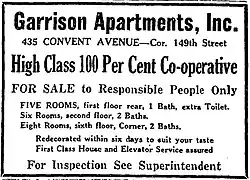 Black real estate developer Samuel J. Cottman began advertising the sale of apartments at 435 Convent Avenue "on the Co-operative Plan" to Black buyers as early as September 1926.[20] It was a story that ran on the cover of the Black newspaper The New York Age on October 2, 1926: