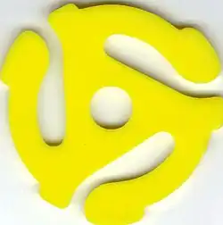 A 45 rpm adapter (also known as a 45 rpm record insert, 45 rpm spindle adapter, spider, or 7-inch adapter in reference the usual size of a 45 rpm record) is a small plastic or metal insert that goes in the middle of a 45-rpm record so it can be played on the standard size spindle of a turntable. The adapter may be a small solid circle that fits onto the spindle (meaning only one 45 could be played at a time) or a larger adapter that fits over the entire spindle of a record changer, permitting a stack of 45s to be played. These larger adapters allowing multiple records to be played are often referred to as 45 spindles. A few manufacturers instead supplied a complete spindle change for 45s.