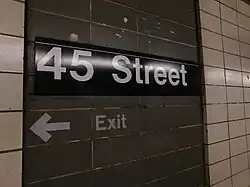 - ^ Cox, Jeremiah (June 5, 2009). "A 45 Street platform sign, text and an arrow for the only exit to 45 St painted beneath it". subwaynut.com. Retrieved December 18, 2018.