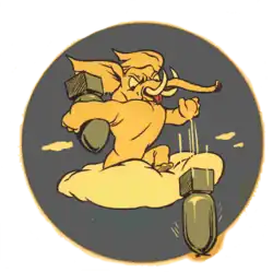 - ^ Approved 17 April 1945. Description: On an ultramarine blue disc, a caricatured yellow orange ferocious elephant, trimmed red and black, with white tusks, standing on hind legs on a white cloud formation, edged black, facing toward sinister holding a large grayed light green aerial bomb under the right foreleg, and hurling, palewise, a like [colored] aerial bomb toward sinister base, leaving white speed lines to rear