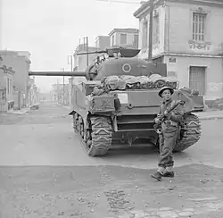 23rd Armoured Bde was in XXX Corps' Reserve for the Second Battle of El Alamein,[17] but in practice each of its regiments was assigned to one of the attacking divisions. When the assault went in on the night of 23/24 October most of the infantry and tanks got held up by mines short of their final objective line ('Oxalic'), but they had overcome the forward defences and lanes were being swept through the main minefields[18] The following days saw the 'dogfight' that Montgomery had predicted. On the night of 28/29 October the 9th Australian Division put in another set-piece attack. 46th RTR supported 26th Australian Brigade, with some of the infantry riding into battle on the Valentines. But the darkness, dust, and scattered mines frustrated the attempt to rush the enemy position. The tanks came under anti-tank and machine-gun fire, forcing the infantry to dismount and lose touch with the tanks. There was confused fighting, after which the infantry dug in, supported by the seven Valentines of 46th RTR that were still running (the regiment's casualties that night were 15 tanks knocked out, and many more damaged, but all were later recovered). Although the attack had fallen short of its ambitious objectives, it had punched a hole between 21st Panzer Division and 90th Light Division, effectively destroying II Bn of 125th Panzer Grenadier Regiment and a battalion of Italian Bersaglieri.[19]
