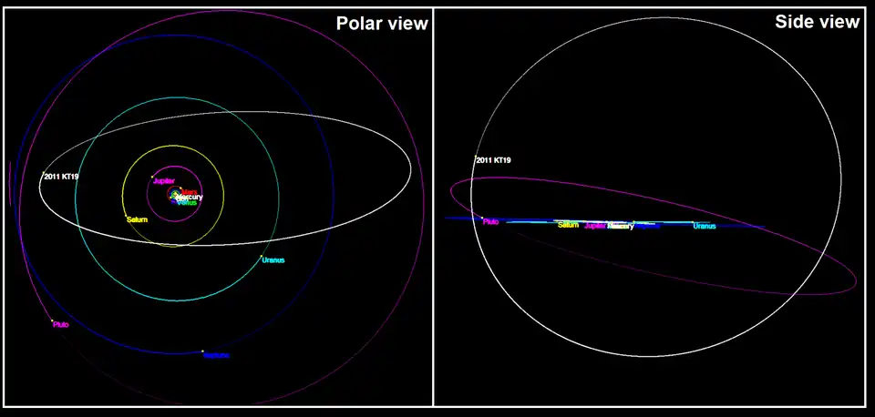 471325 Taowu (provisional designation 2011 KT19, formerly nicknamed Niku (/ˈniːkuː/)) is a trans-Neptunian object whose orbit is tilted 110° with respect to the ecliptic. Thus, it has a nearly polar retrograde orbit around the Sun from the reference point of Earth's orbital plane.[5]