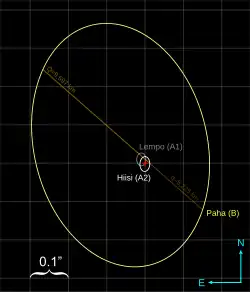 Lempo is a hierarchical triple system consisting of a central primary, which is itself a binary system of two similarly-sized components (Lempo and Hiisi), and a small satellite on a wide and eccentric circumbinary orbit (Paha). The structure of the hierarchy is discerned by denoting the apparent Lempo–Hiisi primary with the letter A and the smaller, outer companion Paha with the letter B; the individual primary components Lempo and Hiisi are distinguished as A1 and A2, respectively.[4] The three components ordered from largest to smallest are Lempo, Hiisi, and Paha.[18]