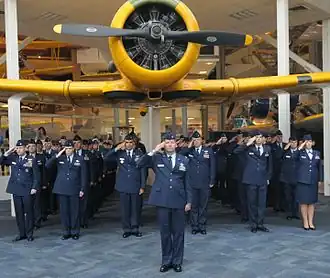 ![]() Members of the 479th Flying Training Group salute during the playing of the National Anthem at the group's activation ceremony | |