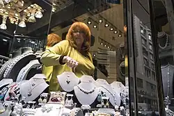 An estimated 90% of diamonds in the United States enter through New York. There were some 3,500 independent businesses (cutting, polishing and sales) in the district in 2019. According to other sources, the district was home to more than 2,600 businesses in 2020, a majority of them were on the same block, many shop owners and managers of the district were Orthodox Jews.[9] The wholesale business made up most of the $24.6 billion in annual sales in 2019. The industry employed 33,000 people, still predominantly Jews.[10] Most businesses are located in booths at one of the 25 "exchanges" in the district. Commission based hawkers are a common sight and they usually solicit business for stores located on the street level.[11]