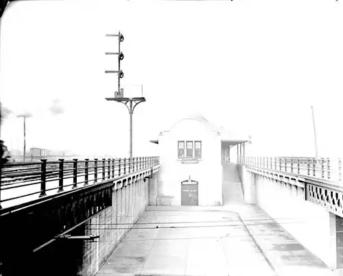 This station replaced an at-grade station on the south side of 47th Street.[5] The station waiting room was 30 by 70 feet, constructed with Bedford lime stone with a slate roof.[6] The Erie Railroad skipped this station after September 29, 1935.[7]