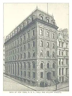In subsequent years, other banks began moving to residential buildings on Wall Street, and by the 1820s, financial institutions made up the vast majority of tenants.[40] In the mid-19th century, many Wall Street banks destroyed their former structures to erect new Greek Revival and Italianate buildings. Among these were the Bank of New York, which in 1856 approved a plan for a four-story structure to plans by Vaux and Withers.[38][40][42] The structure was completed in 1858.[34][43] The brownstone and brick building[43][44] measured 126 feet (38 m) on William Street and 38 feet (12 m) on Wall Street.[43] The interior banking room, with a ceiling 26 feet (7.9 m) high, was located at the building's rear (north) end on the 1st and 2nd stories.[38][43] Two additional stories were built in 1880, including a mansard roof on the top story.[38][40]