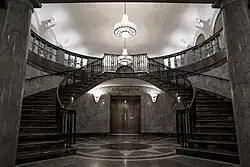 The banking room takes up almost the entire 2nd story, and is divided into three sections. These are the north side of the room, taking up much of the space; a raised area on the south, near the balustrade; and a narrow western section behind an arcade. The space has a black-and-white marble floor; plaster walls with marble wainscoting; and an ornamented ceiling with acoustical tiles and large chandeliers.[23] Inside the banking room are eight arched panels that are decorated with murals: five on the north wall and three on the east wall. The north-wall panels depict scenes from the 18th century and the east-wall panels depict scenes from the 19th century.[23][24][d] These murals were painted by James Monroe Hewlett.[27] Also on the east wall of the banking room are screens leading to the elevator lobby. On the southeast corner is a private office, which includes a marble fireplace mantel and wooden decorations.[23]