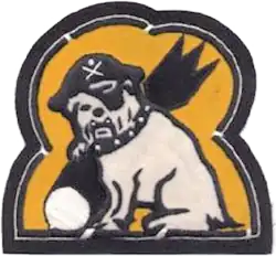 - ^ Approved 7 July 1944. Description: On an irregular-shaped orange figure, broken outline black, a white English bulldog, outlined black, seated on base line of figure, wearing a spiked collar, pirate's hat, and eye patch over left eye, of the last [color]; a large black aerial bomb with white nose resting on dexter base line and supported by right forepaw of bulldog.