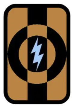 Description: On a buff rectangle with rounded corners 2 inches (5.1 cm) in width and 3 inches (7.6 cm) in height overall with a 1+18 inches (2.9 cm) black border, a black vertical stripe charged with a light blue flash superimposed by a black annulet counterchanged.