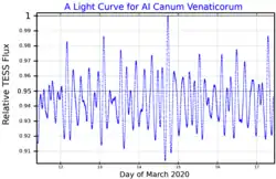 4 Canum Venaticorum is a binary star system in the northern constellation of Canes Venatici, located around 425 light years away.[2] It has the variable star designation AI Canum Venaticorum; 4 Canum Venaticorum is its Flamsteed designation. Its brightness varies from magnitude +5.89 to +6.15 with a period of 2.8 hours,[4] which places it around the lower limit of visibility to the naked eye. This was found to be a binary by Schmid et al. in 2014, based on periodic, non-sinusoidal changes in its radial velocity. It is a single-lined spectroscopic binary with an orbital period of 124.4 days and an eccentricity of 0.31.[3]