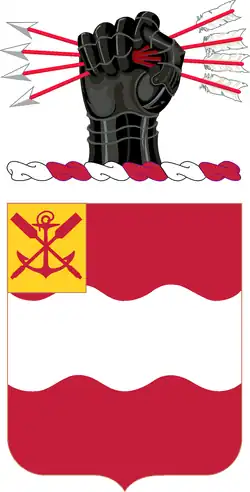 The wavy fess alludes to the outstanding feat accomplished by the organization in World War I, in which the regiment bridged the Vesle under heavy fire, making possible the forcing of the passage by the Division.