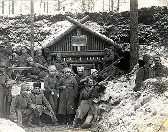 - Ansis Zeltiņš, colonel, commander of the 4th Vidzeme Latvian Rifle Regiment. On 23 December 1916, during the Christmas battles, he and his regiment occupied German fortified dugouts in a stubborn struggle. On 12 January 1917, he again occupied the fortified trenches on Machine Gun Hill and held them under incessant enemy fire until the evening. He was awarded several orders of St. Anna and St. Vladimir, and for his services in the Christmas battles - the Arms of St. George. Also awarded the St. George Cross, 4th Class with a laurel branch.[8]