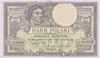 Once the złoty was reinstated in 1924, a 500-złoty note featuring an image of Tadeusz Kościuszko, dated 1919 and printed in advance in United Kingdom, was put into circulation. It was the highest-value note in circulation until the outbreak of World War II.