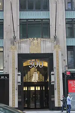 The building's primary entrance is on Fifth Avenue about 70 feet (21 m) north of 42nd Street. Storefronts are located at ground level on the eastern and southern elevations.[5] As a result of the creation of a special Fifth Avenue zoning district in 1929, new buildings on the avenue within Midtown had to include stores on their first two floors.[21] The main entrance is flanked by triple-story pylons.[5][13] Above the entrance is an allegorical limestone relief depicting the building's construction, which was carved by Edward Amateis.[5][15] This relief depicts a gilded woman next to a model of the building, with a staff in her hand.[5][13] Ornamentation depicting a pair of carved eagles is placed on the 42nd Street facade.[22]