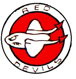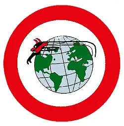 - ^ On a disc white, with wide border gules, a sphere silver-grey, land areas green, north polar region white, longitude and latitude lines and outline black, over the upper area of the sphere a devil's head in rapid motion, a trail from the head streaking around the sphere, all gules, eyeball of devil white, his claw, mouth, eye, and outline detail black. (Approved, 16 Apr 1957) (Maurer p. 217)