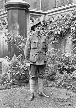 After arriving in France on 11 June 1916, the battalion was committed to the fighting, moving up to front on 28 June.[5] Its first major action came during the Battle of Mouquet Farm during August and September, during which the 50th suffered over 400 casualties.[6] Following this, it saw service attacking the Hindenburg Line in 1917. During actions at Noreuil on 2 April of that year, Private Jørgen Jensen performed the deeds that led to him being awarded the Victoria Cross (VC). Later in the year the 50th Battalion participated in the battles at Messines and Polygon Wood.[4] At Messines, the 50th were initially used to provide carrying parties for the assault, before launching an attack around Blauwepoortbeek late on 9 June. Lacking artillery support, the attack was held up when it came up against uncut wire entanglements and machine guns. A scheduled relief was cancelled and second effort was made the following morning, this time with artillery support, and this succeeded in gaining part of the Oosttaverne Line.[7] The Australians were relieved on 11 June, but before this took place a patrol from the 50th helped soldiers from the British 11th Division occupy Delporte Farm.[8] In late September, during the fighting around Polygon Wood, the battalion took part in the 13th Brigade's attack against the Tokio Spur. Advancing towards Molenaarelsthoek, the attack proved successful and subsequently held the line against a German counterattack that was broken up by defensive artillery and machine guns.[9] The battalion's losses around Polygon Wood amounted to 221 killed or wounded.[10]