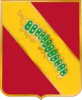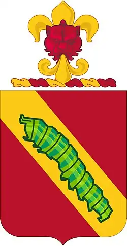 The field of the shield is red, the Artillery color. Service in Lorraine is shown by the bend, a distinctive feature of the Lorraine arms, “Or, a bend Gules,” reversing the tinctures. The caterpillar on the bend symbolizes the tractor.