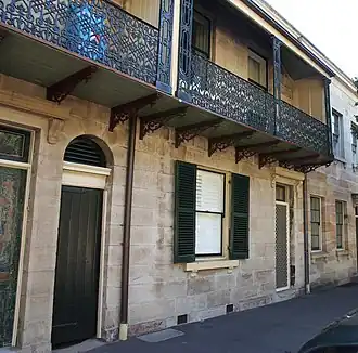 One of a pair of mid Victorian face sandstone terraces with top balconies cantilevered over the footpaths. This residence has three bedrooms. Storeys: Two; Construction: Face stone walls, slate roof to main body of roof, corrugated galvanised iron roof to balcony. Cast iron wall brackets, balcony posts, iron lace balustrade. Style: Victorian Georgian.[1]