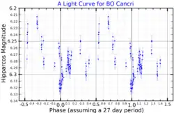In 1969, Olin Jeuck Eggen announced that small vaiarions in the brightness of 53 Cancri had been detected.[7] For that reason it was given a variable star designation in 1972.[8] 53 Cancri is a semiregular variable that varies between magnitude 5.9 and 6.4 with a period of 27 days.[3] There is a suspected second period of 270 days.[9]