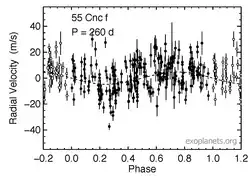 55 Cancri f is located about 0.781 AU away from the star and takes 262 days to complete a full orbit.[10] A limitation of the radial velocity method used to detect 55 Cancri f is that only a minimum mass can be obtained, in this case around 0.144 times that of Jupiter, or half the mass of Saturn.[10] A Keplerian fit to the radial velocity data of 55 Cancri A indicates that the orbit is consistent with being circular, however changing the value in a range between 0 and 0.4 does not significantly alter the chi-squared statistic of the fit, thus a representative eccentricity of 0.2±0.2 was assumed.[1] In a Newtonian model which takes interactions between the planets into account, the eccentricity comes out as 0.0002, almost perfectly circular.[1]