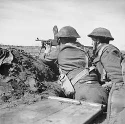 The division remained in the United Kingdom during the Battle of France, moving to the Middle East in November 1942, where it served in Iraq and Palestine, until moving to Egypt in March 1943 and thence forward to Libya and the front, in April.[40] This involved the division, commanded by Major-General Eric Miles, travelling some 2,300 miles (3,700 km) by road, a notable achievement and testament to the organization of the division and the ability of its mechanics and technicians. The division, minus the 168th Brigade, fought in the final stages of the Tunisian Campaign, where it suffered heavy casualties facing the German 90th Light Infantry Division,[42] including its GOC, Major-General Miles, who had been in command since October 1941. He was replaced by Major-General Douglas Graham.[41][40]