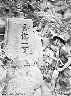 In February 1944 the 15th Brigade moved up the Faria Valley to take over from the 18th Brigade which had been fighting around the Kankiryo Saddle. The 57th/60th Battalion relieved the 2/9th Battalion on the western side of the saddle.[45] The brigade then advanced towards Madang. Moving along the Bogadjim road, the 57th/60th Battalion mounted a company attack on a Japanese position on the high ground overlooking Bogadjim near Bau-ak on 10 April. Three days later they occupied the village of Bogadjim.[46] The 57th/60th continued the advance towards the coast and on 24 April 1944, a patrol from the battalion was the first Allied unit to reach Madang, which had been abandoned by the rapidly retreating Japanese.[8][47]